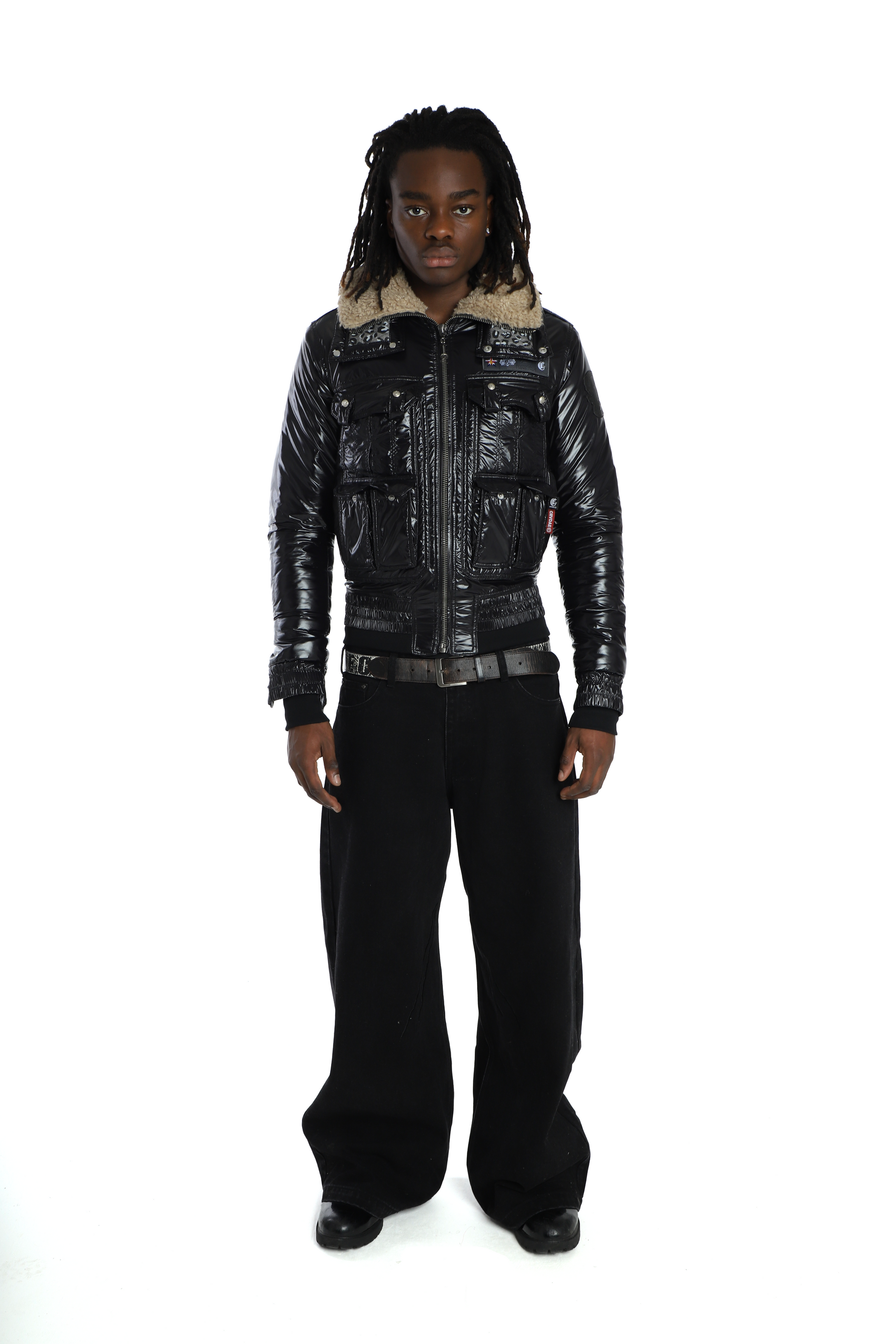 DETAILS: BLACK NYLON JACKETS 10 POCKETS AND LEATHER PATCHES ON BACK. SHEARLING COLLAR WITH HOOD HIDDEN IN NECK. BRANDED BUTTONS