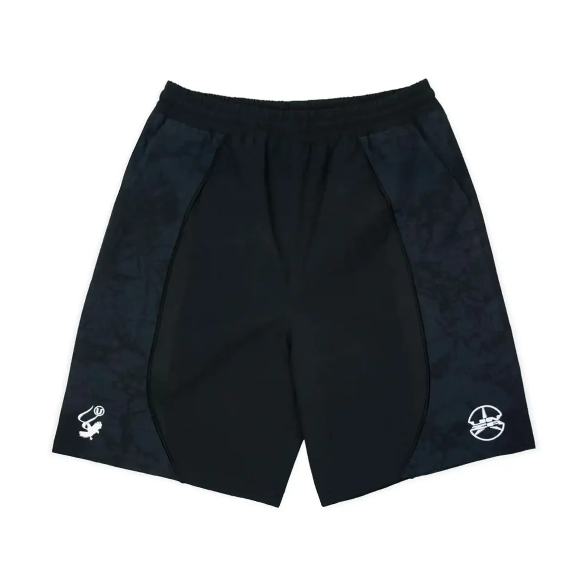 - White polyester shell shorts with contrast lining, printed pattern, embroidery & screen printed branding